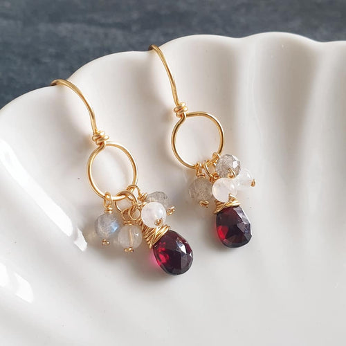 Red Garnet briolette drop earrings with labradorite and moonstone cluster / 14K Gold filled