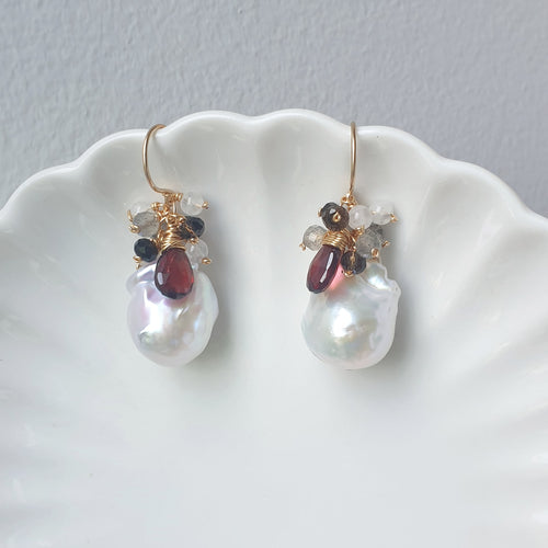 White freshwater baroque pearls with Red garnet briolette and gemstone clusters
