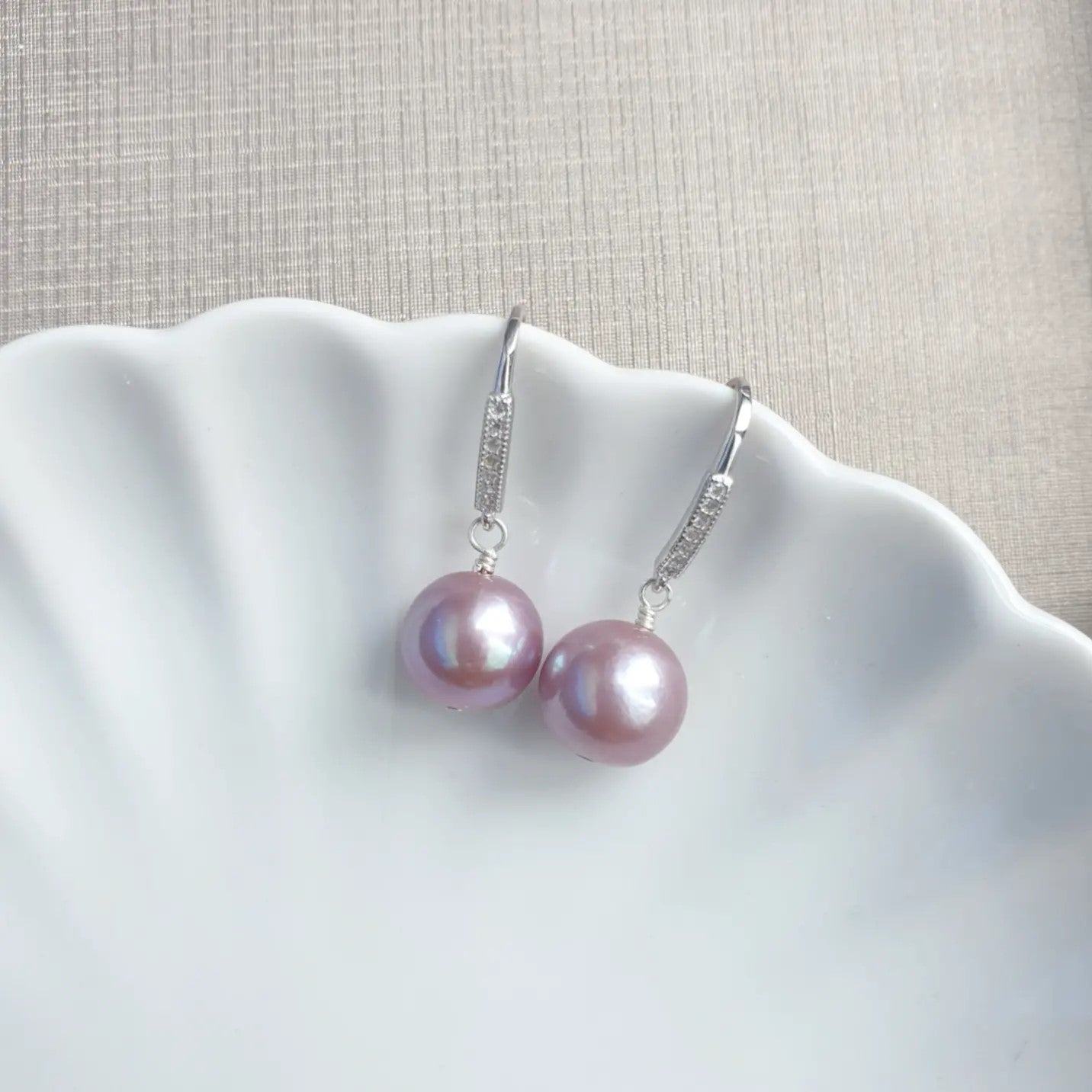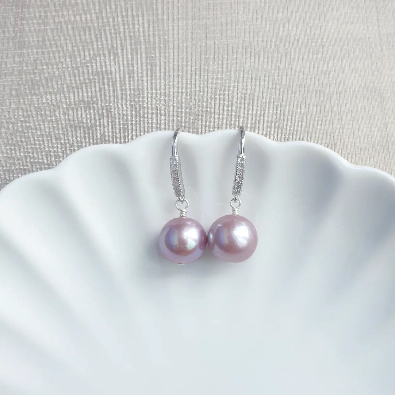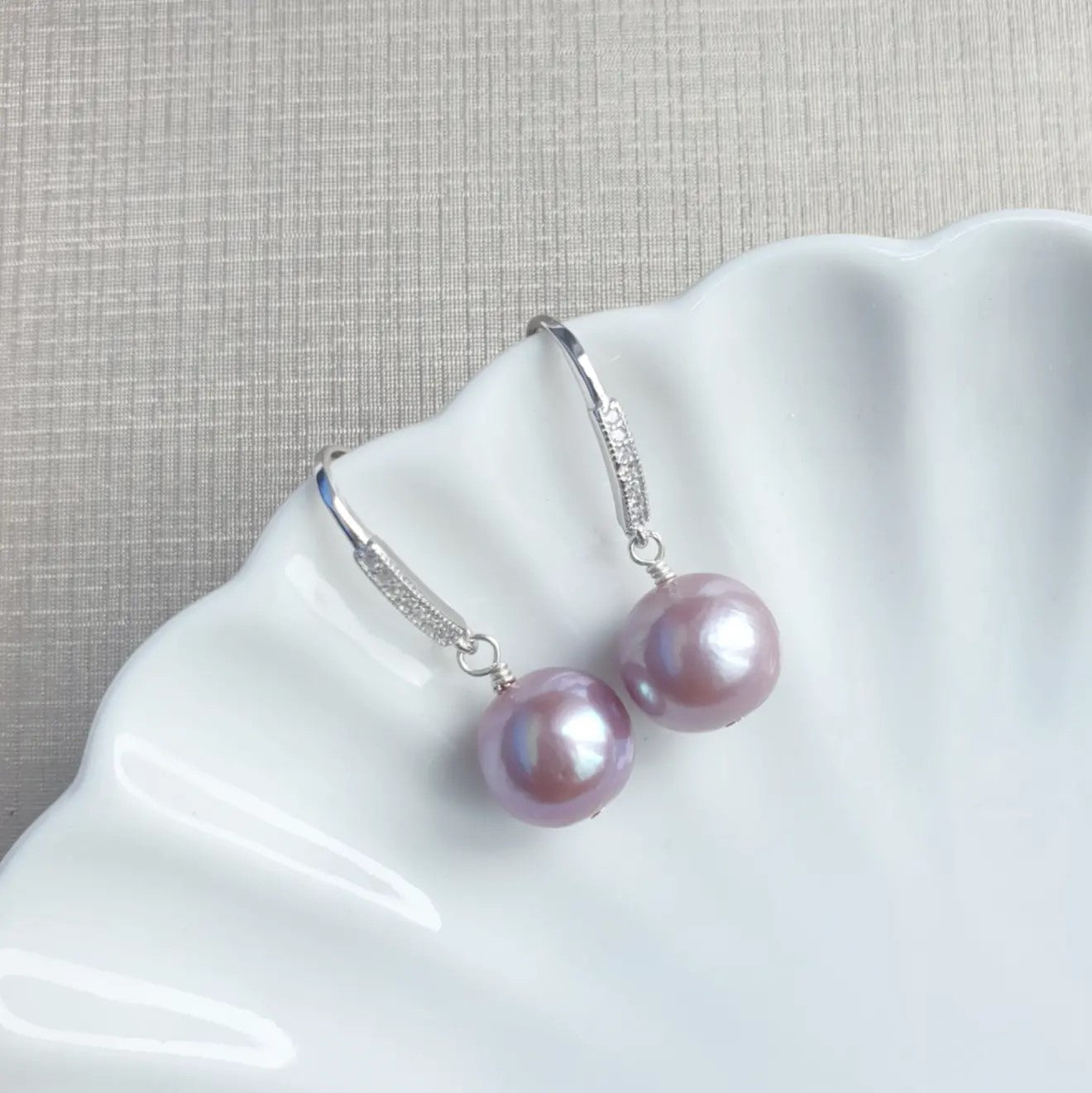 Materials includes lavender edison pearls 10mm paired with sterling silver ear hooks with cubic zirconia.