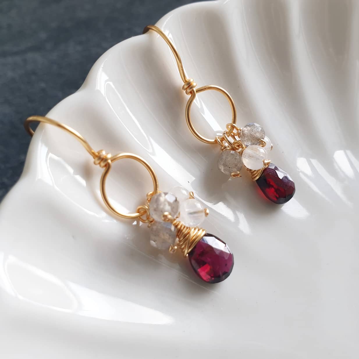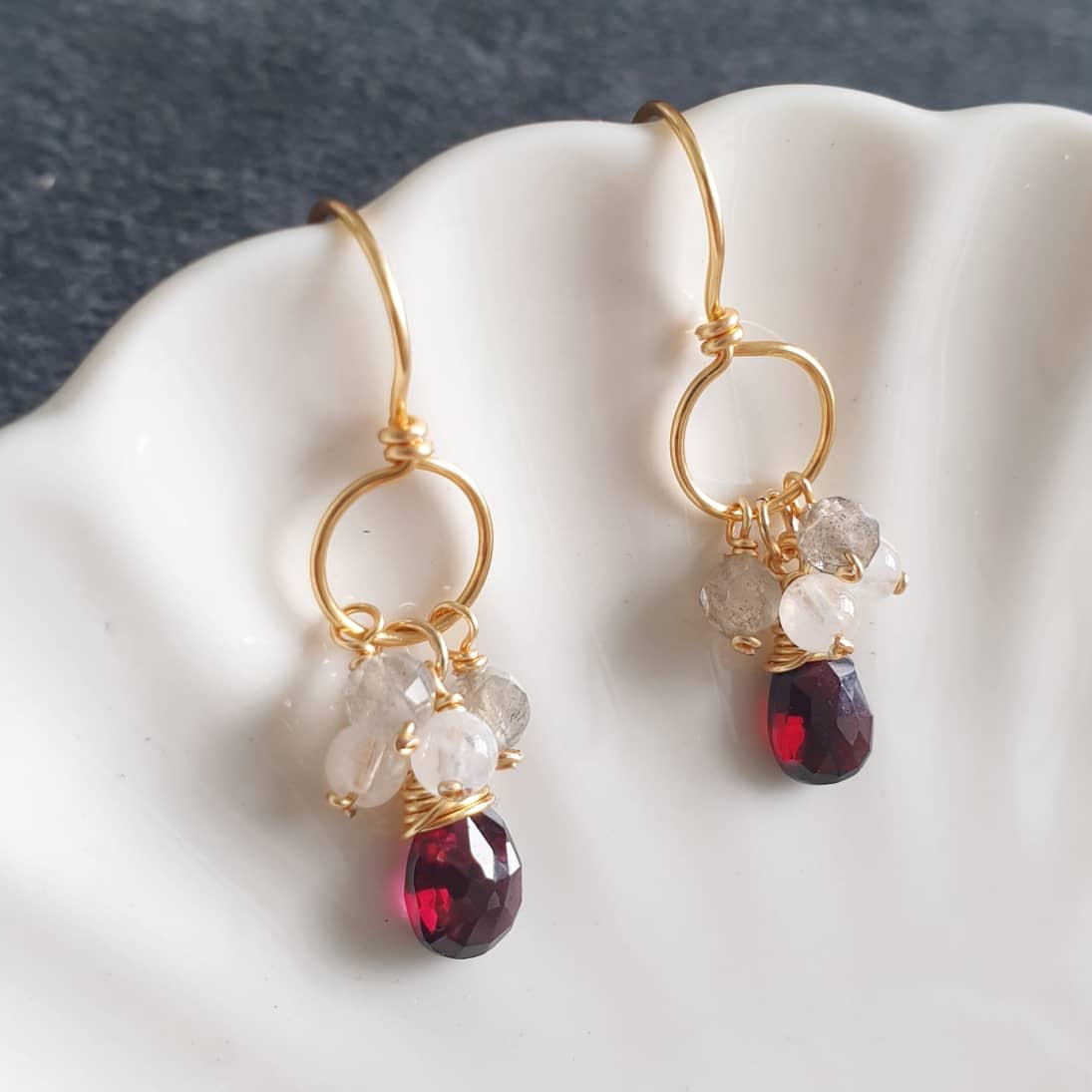 This pair of seductive pair of earrings are made with red garnet briolette drop with cluster of labradorite and moonstones, using 14K gold filled wires.