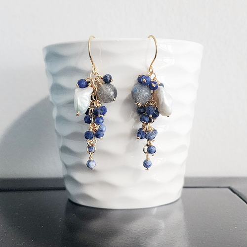 Sodalite cluster with labradorite and keshi pearl dangles with 14K gold-filled earhook