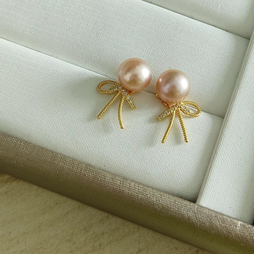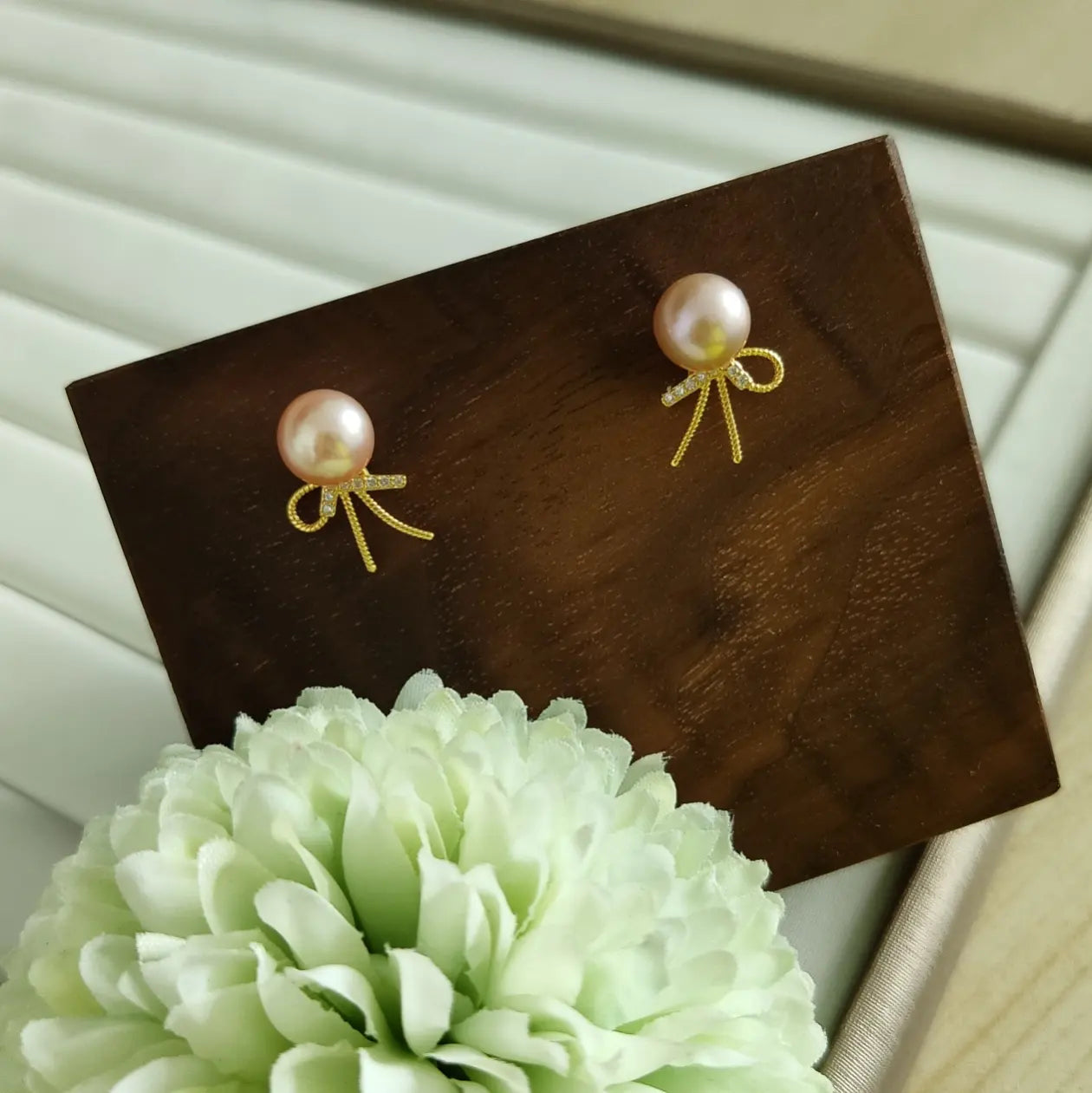 Peachy Freshwater pearls set in dainty ribbon style studs (Gold)